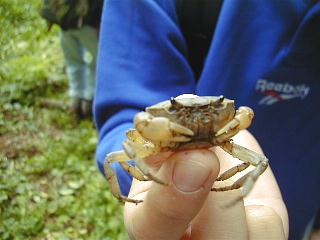 ビオトープで見かけたサワガニ。ハサミが一つとれています。