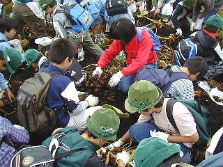 教育センターの庭で、前日に仕掛けたベートトラップを調べます。収穫は少な目。