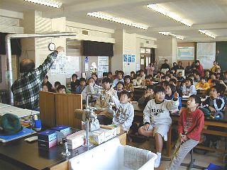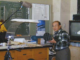 飛行機の翼のモデルに送風機で風を送って揚力の実験。今日は藤沢ケーブルテレビの取材が入っています。