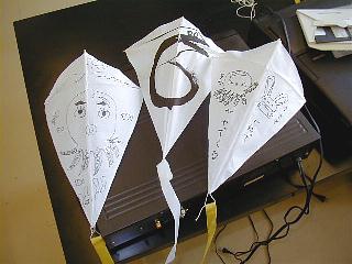 紙と糸だけで作るミニ凧。骨はススキの枝を割いたひご。送風機で風を送るとちゃんと揚がります。しっぽのはたらきなどを観察します。