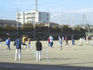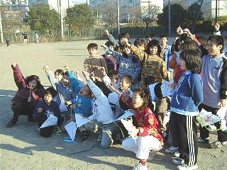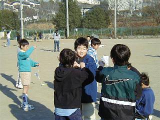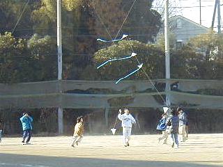 さっそくグランドに出て揚げてみよう。今日はちょっと風が弱いかな。連凧もうまく揚がるぞ。