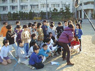 凧揚げのあと、4・5年生はケーブルテレビの取材に協力。「科学少年団、がんばるぞー。オー!」