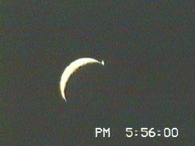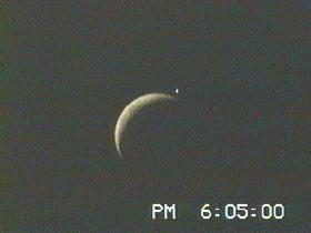 ビデオカメラのズームをいっぱいにすると月の形と金星の位置関係がよくわかります。これだけでもりっぱな天体ビデオが撮れます。この月がやがて東に移動して金星を隠すのです。