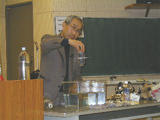 理科部会物理研修委員会主催の講演会が後藤道夫先生を講師に招いて開催されました。ベストセラーになった「子どもにウケる科学手品77」(講談社ブルーバックス)や、続編の「もっと子どもにウケる・・・」にも収録されている面白実験をまじえながら、理科教育への情熱を熱く語っていただきました。