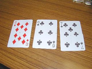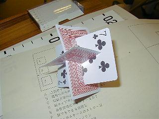 トランプカードの縦横の辺の長さは黄金比になっています。3枚のカードにL字型の切れ込みを入れ、組み合わせると右の写真のような面白い立体ができあがります。まだ驚いてはいけません。このあとの変化にご注目!