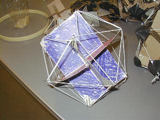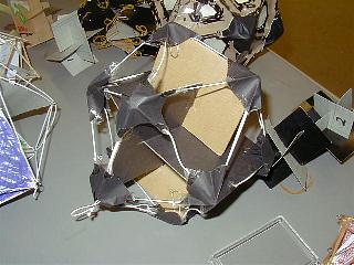 立体に組み合わせたカードの各頂点を結ぶ糸を張ると、正二十面体ができあがります。会場では参加者も輪ゴムで挑戦しました。写真は後藤先生のお手本。さらに、その正二十面体の各頂点を五角形の紙で覆ってみます。さて何ができるでしょう。