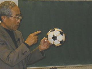 五角形を大きくしていくと、余白は六角形になっていきます。黒い五角形と白い六角形の組み合わせといえば・・・・・。今度は、五角形の厚紙の各頂点を輪ゴムで結んで網の目を作り、中に白い風船を入れて膨らませてみましょう。ほら、「サッカーボール」のできあがり。