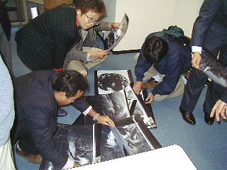 かつてひまわり画像を印画紙に出力していた頃、実際の予報業務に使った本物の雲写真をお土産に分けていただいた。さっそく群がって物色する受講生の方々。