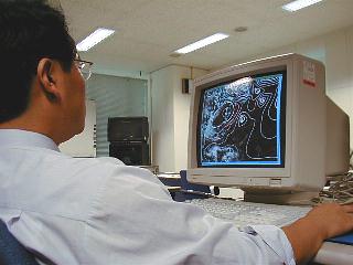 気象情報端末を操作する三浦先生。コンピュータが引いた等圧線や前線位置を、端末上で手動で修正することができる。こうして人の判断を入れながら天気図は完成されていく。