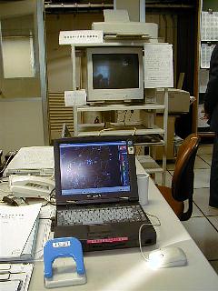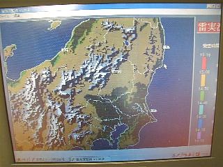 雷評定データ受信監視装置。東電の雷センサによる雷の実況データがディスプレイ上に時々刻々表示される。落雷地点が時間ごとに色分けして表示される。雷雲の動きがリアルタイムにモニターできるしくみだ。