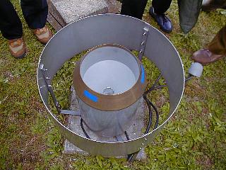 直径120cmの大型蒸発計。水の蒸発量をモニターしている。要するに水をはったたらいである。