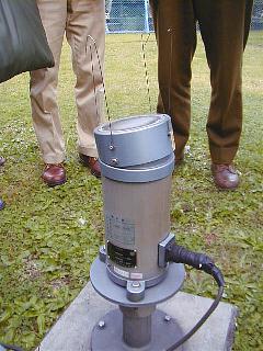 右の銀色の筒は通風式温度計湿度計。上部でファンが回っていて、円筒内に常に一定の気流が作られている。中に温度センサと、湿度センサがある。左側は光電式積雪計。上部のレーザー光源からのビームが、神崎さんが指さしている白い台を照らしている。その反射光をとらえて積雪量を測定する。