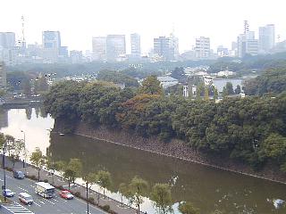 気象庁屋上から見た、皇居と都心のビル群。