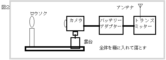 カメラの前でロウソクをともしてカメラ・トランスミッターと共に箱に入れ( 箱は風防代り)、両手で頭上まで持ち上げて箱もろとも床に落下させる。無重力 になると空気の対流が起きないので、長く伸びたロウソクの炎が丸くなるのが観 察できるのでは?という実験である。ロウソク自身が光源なので撮影も楽である。 概念図を図2に示す。もちろん、衝撃に備えて回路部とトランスミッターは緩衝材で保護した後、箱 内にガムテープで固定、カメラ部はむき出しだが、ふっとばないように板に固定 して箱の底にはりつけた。ロウソクも同じ板の上に立ててカメラのアングルを調 整しておく。床にも緩衝材を敷いておく。 さて、ロウソクに火をともし、箱のふたをして、頭の上まで持ちあげて箱ごと 自由落下させる。落下距離は2m程なので、実験は1秒もかからずに終わる。ト ランスミッターが動くことによる画像の乱れもなく、床との衝突の瞬間もはっき りとらえられる。コマ送りで観察すると1秒足らずの実験もゆっくり観察でるの で十分実用になる。 微小重力下のロウソクの炎をコマ送りで詳しく観察すると、落下しはじめる直 前まで長く伸びていた炎(図3a)が、落下の瞬間急に半分以下の長さに縮み、 火勢が衰えるように見える(図3b)。空気の流れが悪くなって酸素の供給が不 足するためだと思われる。しかし、炎は完全に丸くはならず、やはり紡錘形をし ている。原因はよくわからないが、空気の流れが若干はあることになる。箱が受 ける空気抵抗で、完全な無重力にはならないためかもしれない。 そして、床への激突の瞬間、炎は平常燃焼時よりも極端に伸びて(図3c)、 直後に衝撃のため消える。炎が伸びるのは炎の周りに瞬間的な強い気流が生じて いることを示している。おそらく急減速の際、上向きの大きな加速度のせいで (みかけの)重力が増し、浮力も大きくなるので強い上昇気流が発生するのだろ うと考えられる。もちろん一瞬のことであるが。