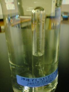 ゴム栓には直径2ミリほどの細い穴があけてある。こうすると水は通るが、ボトルが転倒しても中の空気が漏れないので展示向きである。生徒実験ならゴム栓は不要。
