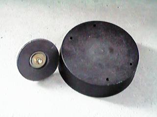 上の写真はこれの自作版です。コマは廃物のビデオデッキから取り出したブラシレスモーターの回転子。片面6極着磁のフェライト磁石です。これに軸を取り付けてコマにしました。ベースは壊れたモビール(よくファンシーショップで売ってるヤツ)の台座です。回路は上記の磁力ゴマと同じですから転用できます。