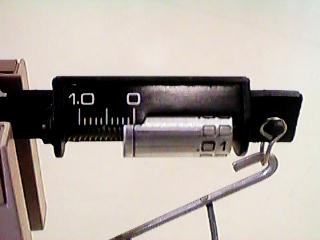 バーニヤ部拡大。銀色のシリンダーがスクリューになっていて微動する。先端位置で100mgの位、シリンダー上の目盛りで10mgの位を読む。