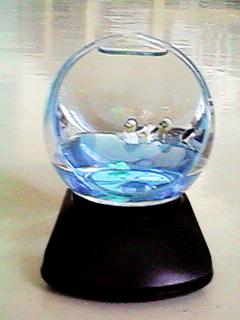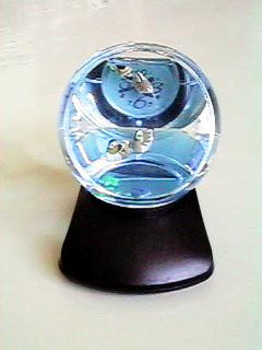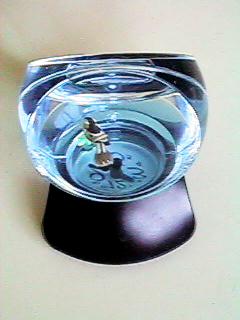 街でも見かけるファンシークロック。おしどり夫婦がカメに引かれて泳ぎ回る。 文字盤は反射像だ。本物の文字盤はこの角度からは見えない。全反射のためだ。 中の液体はたぶん青い方が水、透明なのが灯油だろう。 上から見ると底部にある本物の文字盤が見える。裏返し、逆回転の時計だ。 カメは磁石で秒針に引かれて動く。