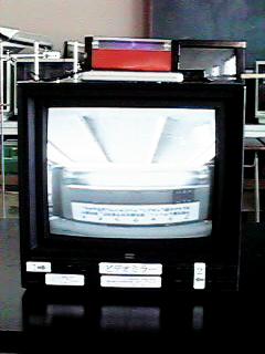 カー用品店で安売り(\5000)していた後方確認用の車載固定CCDカメラ(モノクロ)を粗大ゴミのテレビに取り付けた。スイッチを入れれば自分の姿が画面にうつる。テレビカメラを使っていろいろな実験をしてみよう。