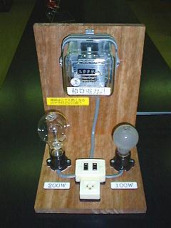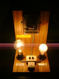 どこの家にも必ず一台はあるのがこの機械。使用電力を積算して電気料金を求めるために使われます。 100Wの電球(右)と、200Wの電球(左)を点滅して比較すると、使用電力によって内部の回転板の回転速度が変化するのがわかります。