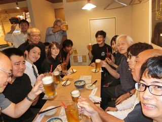 16名が参加してカンパーイ!例会本体には対面で23名、オンラインで11名、計34名が参加し盛会となった。そして、例会参加者の半数以上が二次会にも参加している。今回の会場は、コロナ禍前の2019年5月以来6年ぶりである。ようやく、学校会場が安定して提供していただけるようになって大変うれしい。