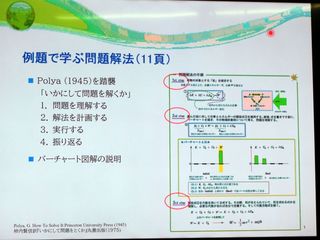 複数の表現を組み合わせて提示することにより、こうした困難が軽減される。例会では、そうしたいくつかの事例の紹介があった。下図は、右近さんが前任の大学で学生を対象に行った調査用の模擬教材の一部である。ポリヤの解法や、図や方程式から逆に問題を考えさせる「ジョパディ問題」も取り入れられている。