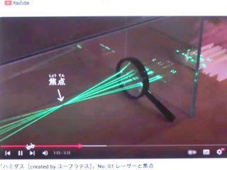 もちろん、下の虫眼鏡の映像などは実際に実験してリアルで見せた方が良いのだが、それでも、生徒が復習がてら動画をながめると理解が深まることもあるだろう。教員の目で見ると「演示実験をどのように見せるか」のヒントを貰えるかもしれない。