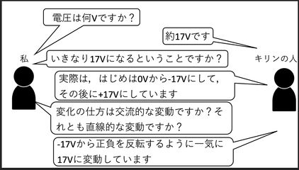そこで鈴木さんは、電圧の値や、電圧をどのようにかけているかが気になり、キリンの担当者に質問した。約17Vの電圧をかけており、初めは-17Vにして、その後で一気に+17Vにすることで、一気に塩味を感じるような工夫がされていることを知った(左図)。