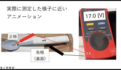 そして、実際に検証してみたくなった。ちょうどデジタルマルチメーターを万博に持参していたため、測定してみた(測定時の写真を撮り忘れていたので、以下の画像はイメージ)ところ、実際にキリンの担当者の説明の通りに電圧が変化することを確認することができた(右図)。