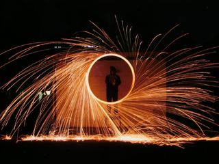 円運動のファイヤーダンスは2017年8月の合宿例会で発表したものだ。元々は海外の実験動画(YouTube) を見てやってみたものだという。向心力は糸の張力なので、円運動における力の向きが進行方向に対して垂直なのはイメージが湧くが、円運動から外れた物体が接線方向に飛んでいくのはイメージができない生徒がいるようだ。見応えがある写真をとるまでに20回以上の練習を重ねたが、その甲斐あって、毎年生徒から歓声が上がるのは嬉しいという。