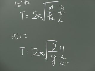 単振動では、一般によく行われる順序で作図から入って、ばね振り子や単振り子を理論と実験を照合する形で展開する。おなじみの周期の公式(右図)で、ばね振り子を「みかん」、単振り子を「りんご」と語呂合わせを紹介すると生徒は笑ってくれる。暗記用と言うよりは、自分の計算した答えが正しいかどうかの答合わせに使えるよと紹介している。