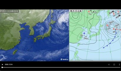 会場校に併設されている中学校に勤める藤澤さんは、tenki.jpの気象衛星雲画像と気象庁が提供している3時間ごとの地上天気図を1年分集約し、パラパラ動画にして毎年提供してくれている。気象衛星のみ/天気図のみ/気象衛星&天気図の3種類のメニューがある。特に、雲画像と天気図が対照できるモードは便利だ(右図)。会場ではオフラインでも使えるDVD(左図)が無料で配布されたが、オンラインでも藤澤さんのWebページ「日本付近の気象衛星画像/天気図 2025年版」から参照/ダウンロードできる。