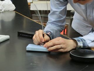 平野さんは、学校で使える教材の開発・情報提供をしている電気学会からいただいた教材のキットの一部を用いて、無線給電のモバイルバッテリーで遊んでみた。15回程度巻いたコイルにLEDをつなげたものをモバイルバッテリーの上に置いてボタンを押すと点滅し、しばらくすると消える(左図)。充電できる端末が置かれなければ、電源はすぐに切れるらしい。会場での「充電中の様子はどうなるか」という質問について、後日追実験をしたところ、バッテリーとスマホの間にコイルを挟むと、一瞬明るく輝いてLEDが切れてしまい、コイルの巻き数を減らしたら点灯し続けたとのこと。
