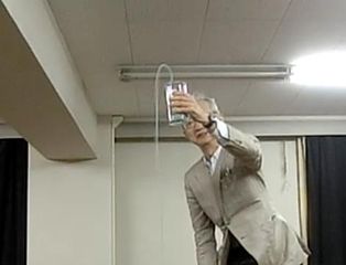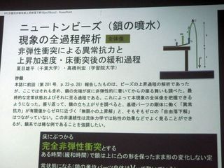 ニュートンビーズとは、高いところに蓄えた長い鎖をその一端から自由落下させると、噴水のようなアーチがたぐり出し点の高さより上に立ち上がる現象である(左図)。動画(movファイル5.8MB)はここ。テレビでこの現象を紹介したこともある夏目さんは、この現象の力学的全解析を追究してきた。地元の千葉で行われた今回の例会で、その概要を紹介してくれた。