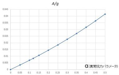 が有限の時、A/g の正の根を α の関数としてグラフにすると右図のようになる。これを見ると、現実的な値(α=0.3~0.4)では、自由落下の加速度g/3の十分の一程度であることは興味深い。