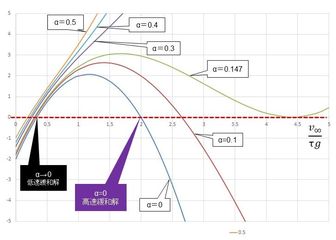 という極限で v∞ ⁄gτ→1⁄3 となる解が実現する。α=0とα→0は解析的に連続しない。