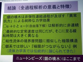 現象を支配する有限なパラメータが無限に小さくなった極限と、もともとゼロだった場合とが異なる、ということは流体力学問題にはしばしばあるとのこと。そのような特異性がニュートンビーズという鎖系で出現していることが珍しいと夏目さんは強調する。