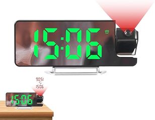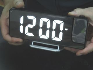 天野さんが見せてくれたのは「プロジェクター時計」。一見、数字が大きいだけのデジタル置き時計に見えるが、右側部分がプロジェクターになっており、壁や天井に時刻を投影できる。高輝度の赤色LED表示器の数字をそのまま光学的に投影しているようだ。投影方向は右図のように調節できる。暗い寝室などでわざわざ起き上がって時計を見る必要がないという便利アイテムだ。表示に電流を食うらしく、投影し続けるには外部電源が必要。