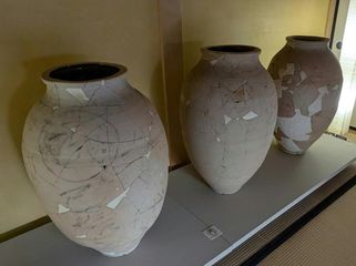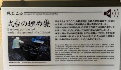 函館での用事が済み、時間があったため、古谷さんは五稜郭公園内に再建された「箱館奉行所」を見学した。その際、3つの瓶(かめ)が展示されているコーナーが目に留まった(右図)。「見どころ 式台の埋め甕」という解説によると「再建のための発掘調査の中で掘り出されたもの。玄関と内玄関の式台跡から信楽焼の大瓶が発見された」とのこと(下段左図)。そして、瓶は「音の反響のため」であること、「同じような目的としては能舞台がある」と解説は続いていた。