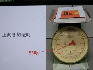 上向き加速時は、550gとなり、慣性力を実際に数値で体感することができた。そして、この値を元に加速度を求めると1.2m/s2となった。これより、学校の1階から2階の高さをざっくりと計算したところ、6mとなり、妥当な値を求めることができた。