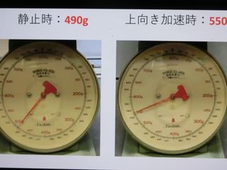 鈴木さんは学校にあるエレベーターで、慣性力を利用した実験を行ない、加速度を測定して校舎の1階から2階の高さをざっくりと求めた。「物理の教科書」に、はかりに乗ってもらった。YouTubeの動画はここ。